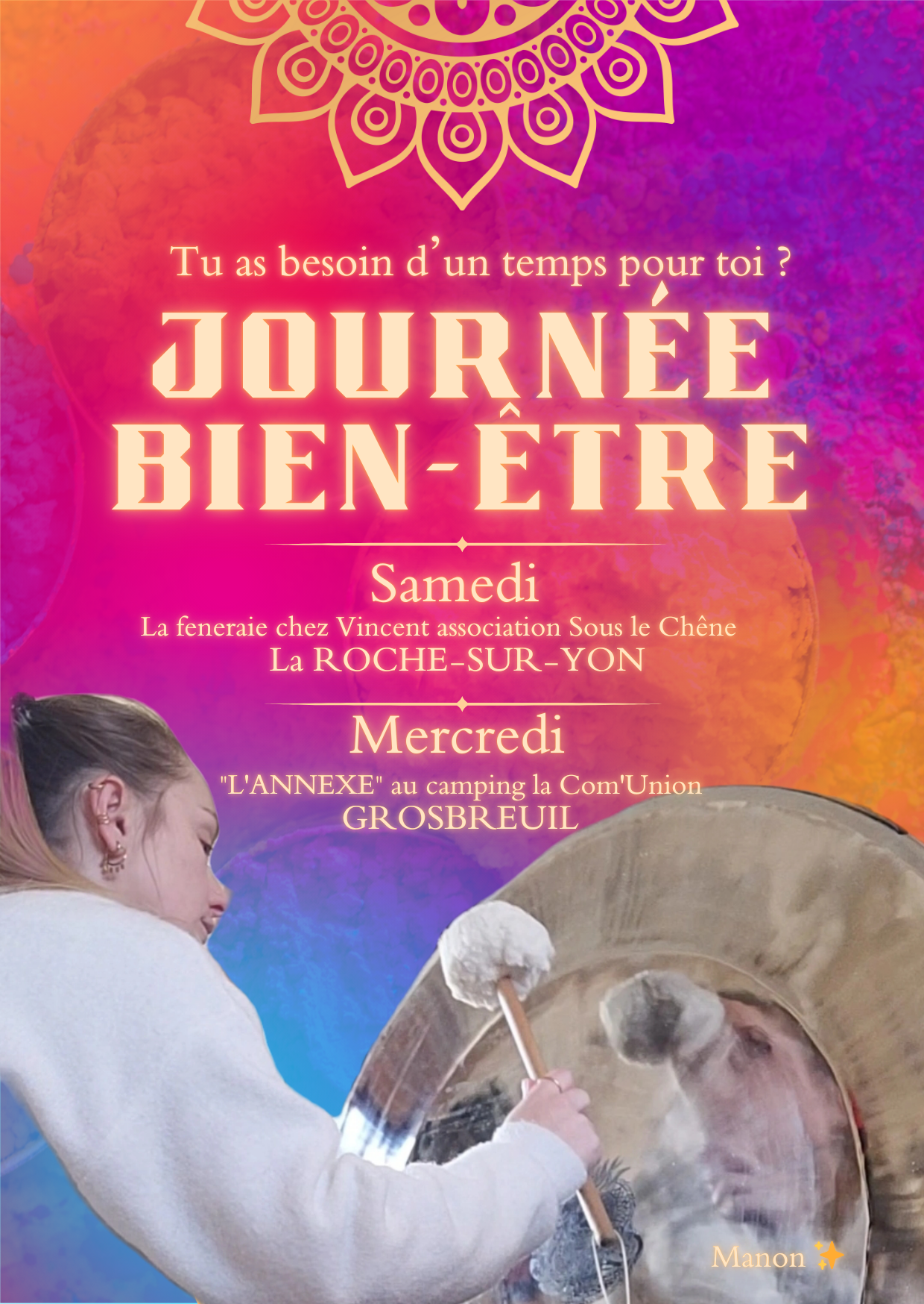 La JournĂ©e de Bien-Ătre collective est un espace dĂ©diĂ© aux chants de mantras et au bain de gong, oĂč lâĂ©nergie du groupe soutient le nettoyage des frĂ©quences basses et lâaccueil de frĂ©quences plus hautes : amour, abandon, joie, bonheur, plaisir.